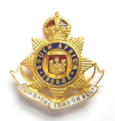 A rare First World War period 23rd County of London Battalion miniature cap badge style gilt and enamel sweetheart brooch, bearing the Arms of Guildford and "South Africa 1900-02" honour. Very good condition, original pin fittings, no damage to the enamel, an excellent example.