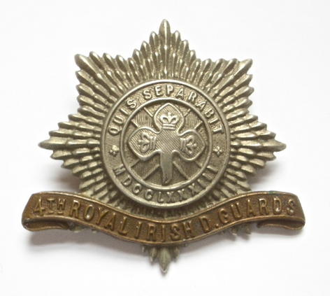 A rare original pre 1922 die-stamped white metal '4th Royal Irish Dragoon Guards collar badge', the reverse with original two loops replaced by pin fittings. Good condition.