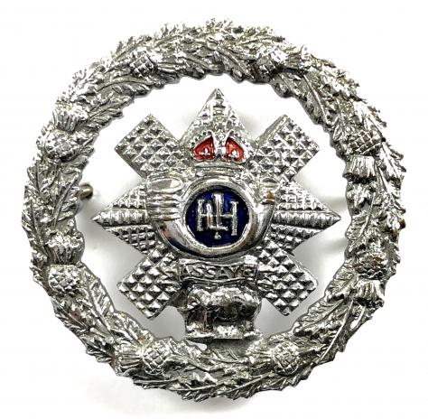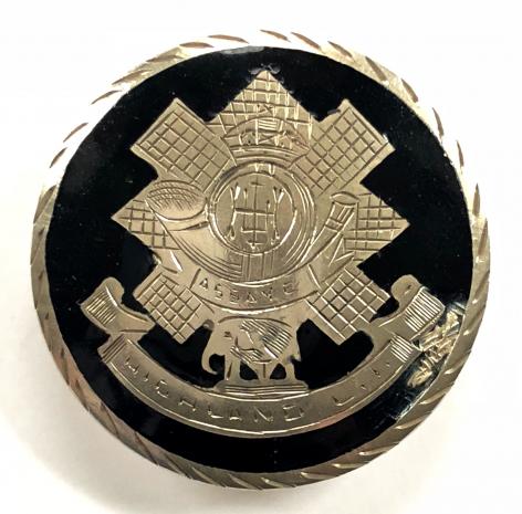 A scarce original First World War period 'Highland Light Infantry silver sweetheart brooch' the badge set within a black enamel ground, the reverse impressed 'Sterling Silver' and with maker's details 'F.R.G' (F R Gomm, Birmingham). Good condition, complete with original pin fittings, enamel with small chip lower right. Price reflects.