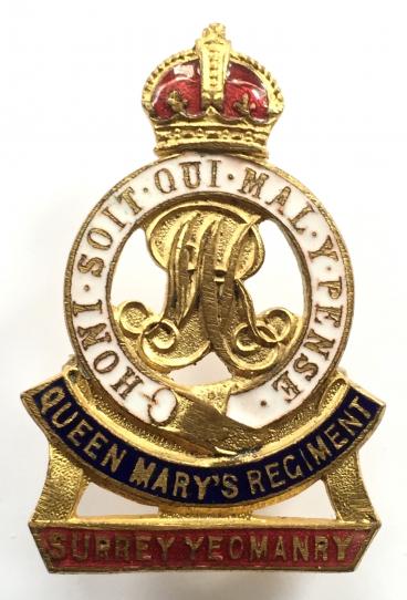A scarce First World War period 'Queen Mary's Regiment Surrey Yeomanry sweetheart brooch'; large gilded brass example, the centre bearing the Royal Cypher "MR" within the 'Garter' adopted in 1910. Very good condition, retaining original pin fittings, enamel perfect, gilt remains bright.