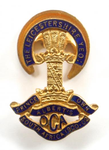 A scare post 1922 period 'Leicestershire Yeomanry gilt and enamel Old Comrades Association badge'; 'Saxe-Coburg device with horseshoe title 'Leicestershire Yeo' above, with 'Prince Albert's Own' and "OCA" scroll below with a further "South Africa 1900.02" honour scroll to the base; the reverse impressed with maker's detail "J.R.Gaunt, London". Very good condition, retaining original but... read more