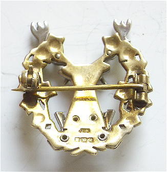 A superb quality Elizabeth II 'Gordon Highlanders sweetheart brooch', set with paste diamond stones and decorated with rich green translucent enamel, the reverse bearing Birmingham silver hallmarks for 1990 and maker's details. Very good condition, retaining original pin fittings incorporating safety roller catch and complete with its original retailers leather case.
