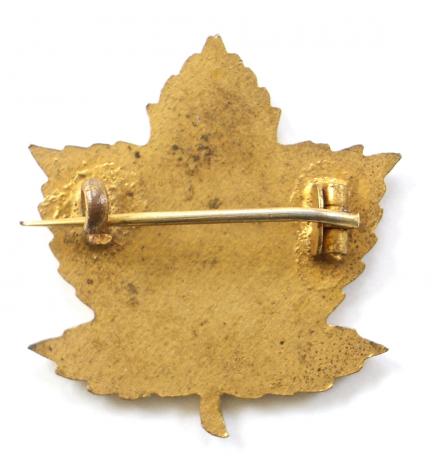 A scarce First World War period Canadian Expeditionary Force '25th Infantry Battalion CEF sweetheart brooch' gilt maple leaf bearing enamelled scrolls "Overseas Nova 25 Scotia Canada". Very good condition, retaining original pin fittings, no damage to the enamel, gilt remains bright, an excellent example.