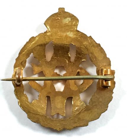 A scarce First World War period 'Army Veterinary Corps sweetheart brooch', gilded brass crowned laurel wreath with 'AVC' monogram to the centre. Very good condition, retaining original pin fittings, enamel with minor service wear to crown, gilt remains bright