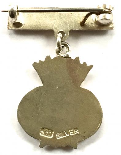 A scarce fine quality Second World War period 'Merchant Navy sweetheart brooch, fashioned on the style of the 'War Service badge', a naval crowned oval roped border with "MN" to centre and Mercantile Marine coloured enamel suspension bar, the reverse impressed "Silver" and with maker's details "J.F" (James Fenton). Very good condition, retaining original pin fittings, no stress or damage to the enamel, an excellent example.