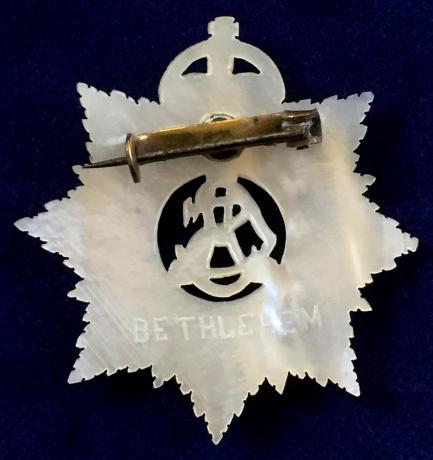 An unusual circa 1930's period scarce 'Army Service Corps hand-carved mother of pearl sweetheart brooch' of large measure, made in the Middle East using a cap badge as a guide, this example enhanced with blue inlay to the lettering and inscribed 'Bethlehem' to the reverse. Very good condition, complete with original pin fitting.