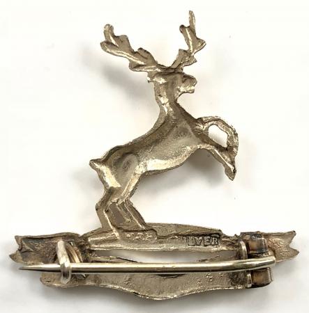 A very rare Great War period 'Huntingdonshire Cyclist Battalion silver and enamel sweetheart brooch'; prancing stag on ground with blue enamel scroll below. The reverse impressed "Silver" with maker's details "W.J.H" (William J Holmes Birmingham). Very good condition, complete with original pin fittings, enamel with possible restoration.