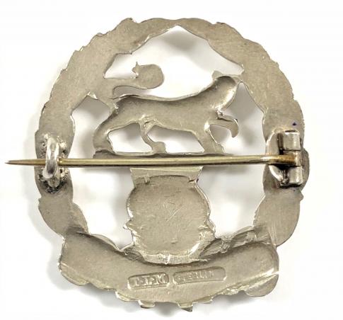 A scarce original First World War period 'Hampshire Regiment silver and enamel sweetheart brooch' in the form of a minature representation of the cap badge, the reverse impressed 'Sterling' and with maker's details 'T.L.M.' (Thomas Lyster Mott). Very good condition, complete with original pin fittings, enamel intact.