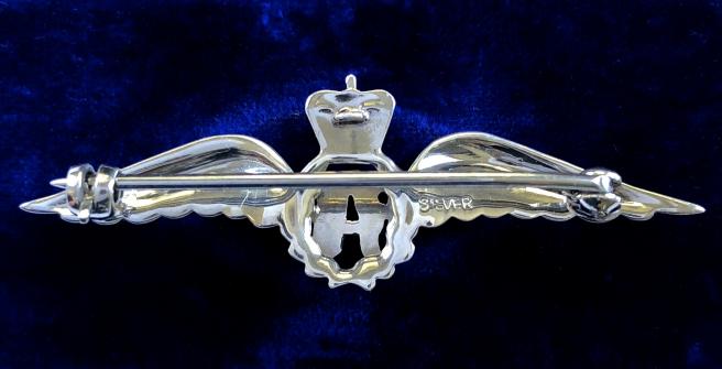A scarce original early Elizabeth II period 'fine quality Royal Air Force rhodium plated sweetheart brooch'; 'RAF' monogram inlaid with rich blue enamelling, within Crowned laurel wreath, flanked by finely feathered wings decorated with marcasite stones; the reverse impressed 'Silver'. Excellent condition, complete with original pin fittings with safety roller catch in good working order, enamel perfect, complete with all stones.