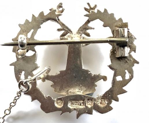 A scarce original First World War period 'Gordon Highlanders silver sweetheart brooch' in the form of an officer's regimental cap badge, bearing the crest of the 'Marquis of Huntly,' a stag's head issuing from a Ducal Coronet within a heavy ivy wreath, with the motto 'Bydand' below, the reverse impressed with Edinburgh silver hallmarks for 1915 and with badly struck maker's details 'H.T' (Henry Tatton, Rose Street, Edinburgh, Scotland). Very good condition, complete with original pin fittings and safety chain.