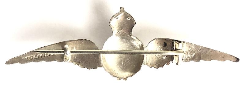 A scarce original Second World War period 'Royal Air Force silver pin badge' large highly defined feathered wings, the centre bearing red enamel King George VI crowned green enamel laurel wreath with 'RAF' crest inlaid with blue enamel; the reverse impressed 'STERLING SILVER't and with maker's details 'AP' within a circle. Very good condition, complete with original pin fittings.