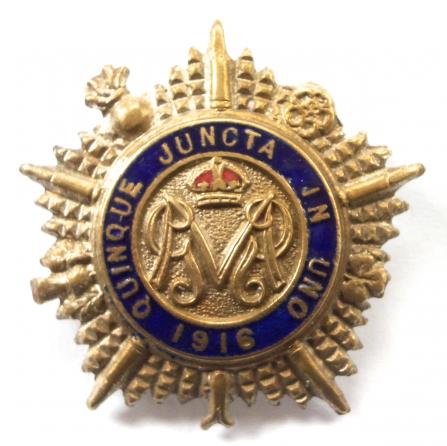 A stunning First World War period fine quality 'Royal Fusiliers gold and enamel sweetheart brooch', designed on the style of the cap badge, flaming grenade with applied Garter, bearing the motto "Honi Soit Qui Mal Y Pense" (evil to him who evil thinks) surmounted by a King's Crown with central device of a silver rose, the reverse impressed "15" and "15ct" to the pin (pre 1931 15 carat ... read more
